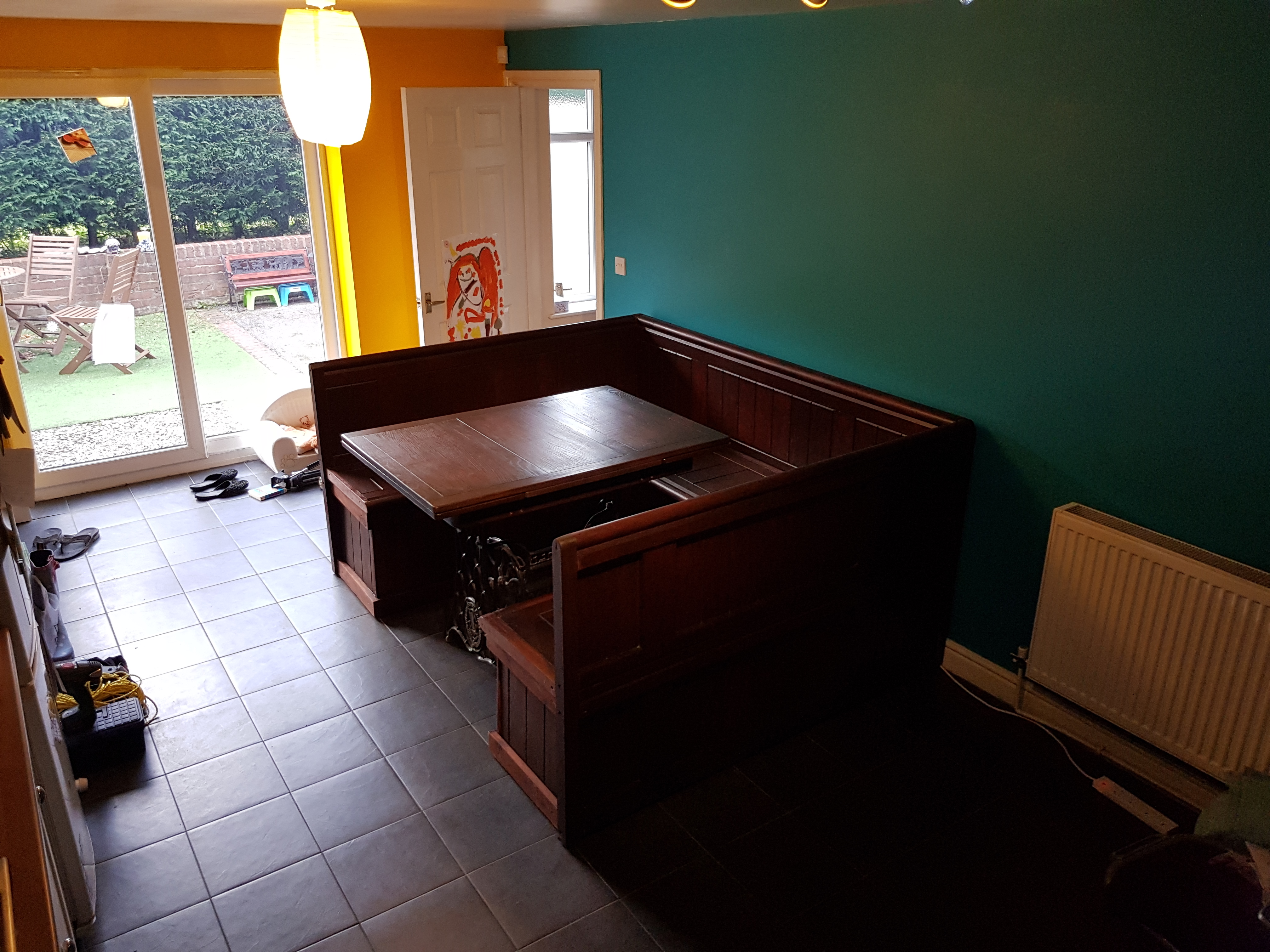 After all the designing , planning and measuring of church pew bits. Which were originally designed to fit around an existing table the client already owned. She confessed she wanted to find a new one which matched the style of the booth seat better.