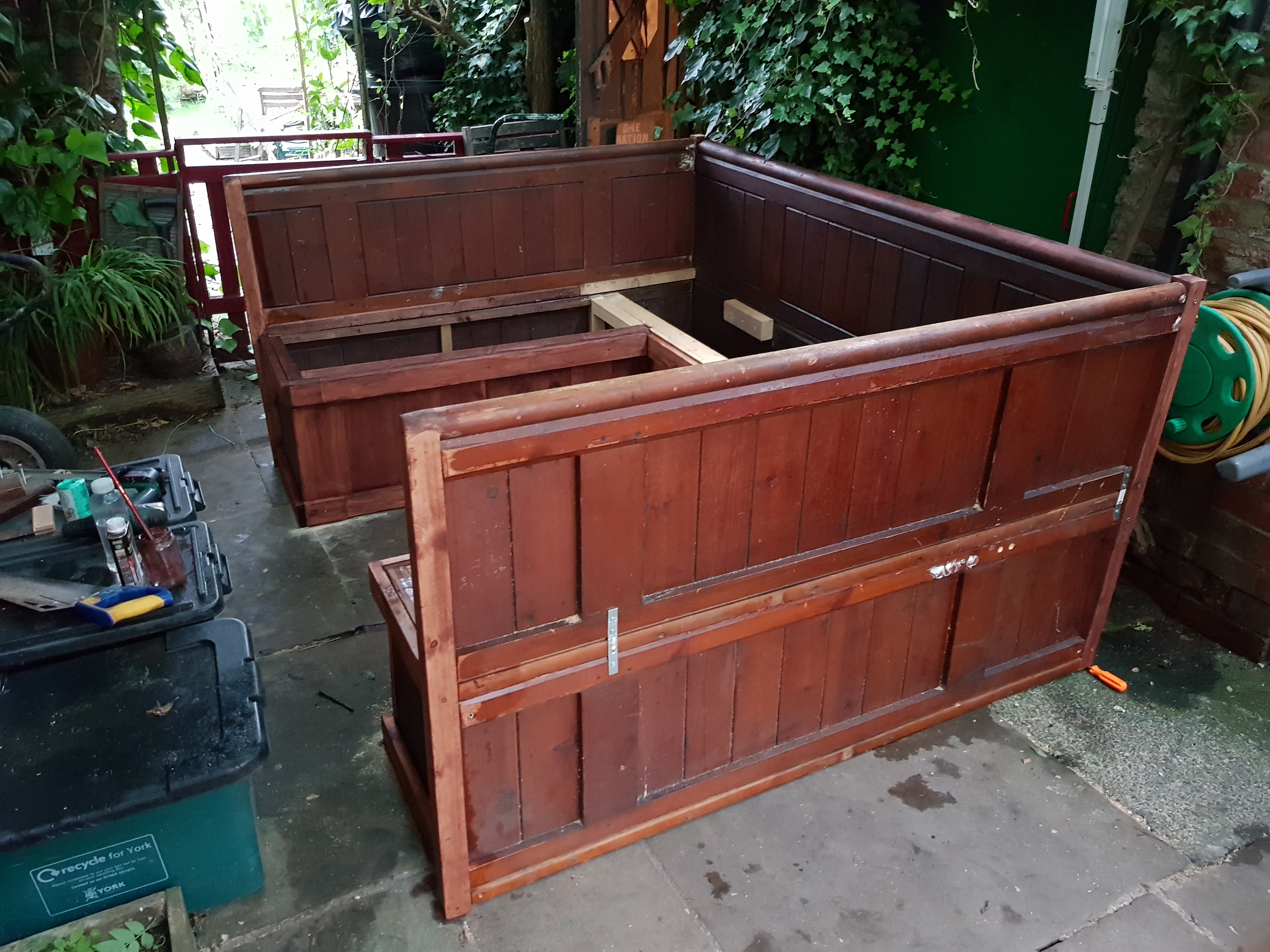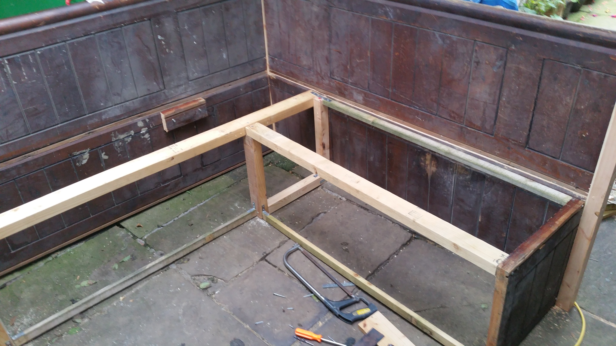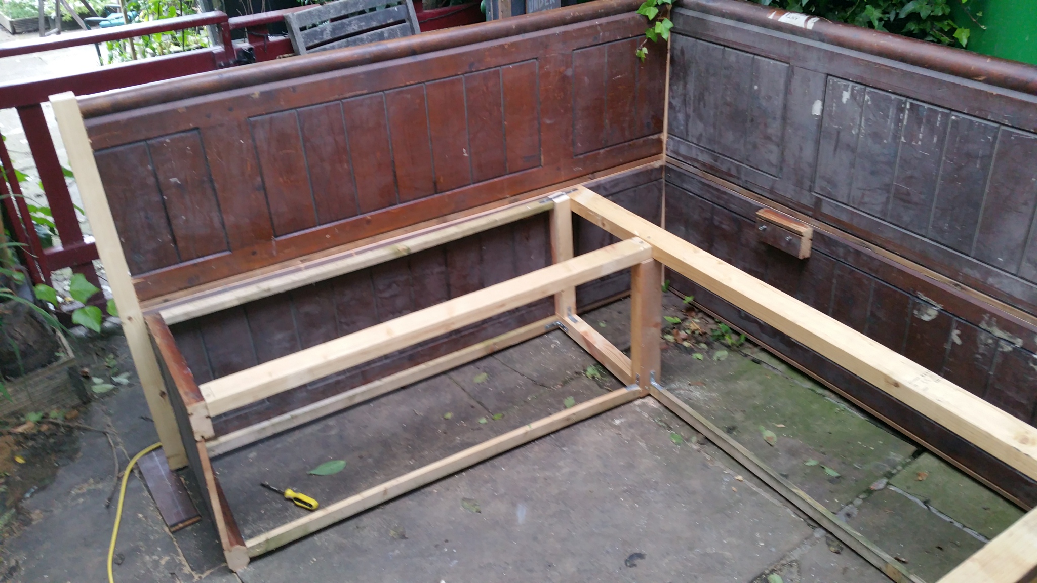 Now for the difficult part. I now needed to build the internal structure, the frame that the seats would attach to….and that would hold the whole thing safely together. Normally it would be done the other way round, you would build the outside around the inside, but the simple fact of the matter was I couldn’t cut the pews to the desired sizes without ruining their beauty.