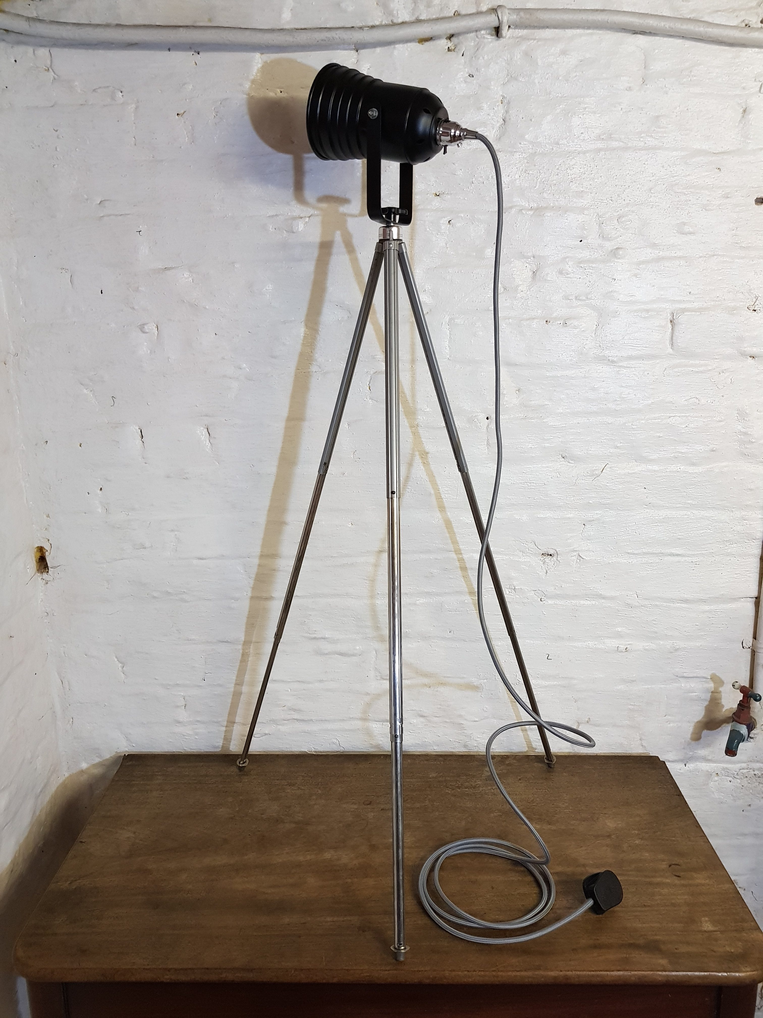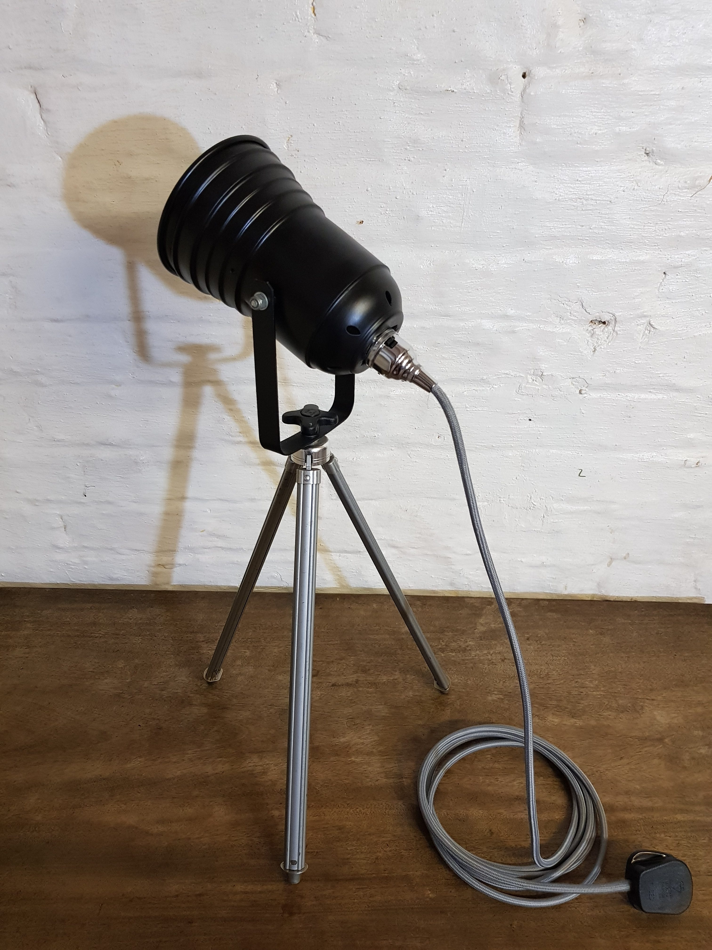 Constructed from a set of old directional wall mounted spot lamps, which i reclaimed from an office refit. Giving them a good clean and a re-paint. Then adding them to some old-fashioned extendable sword foot camera tripods which i picked up from various car boot sales and online market places.