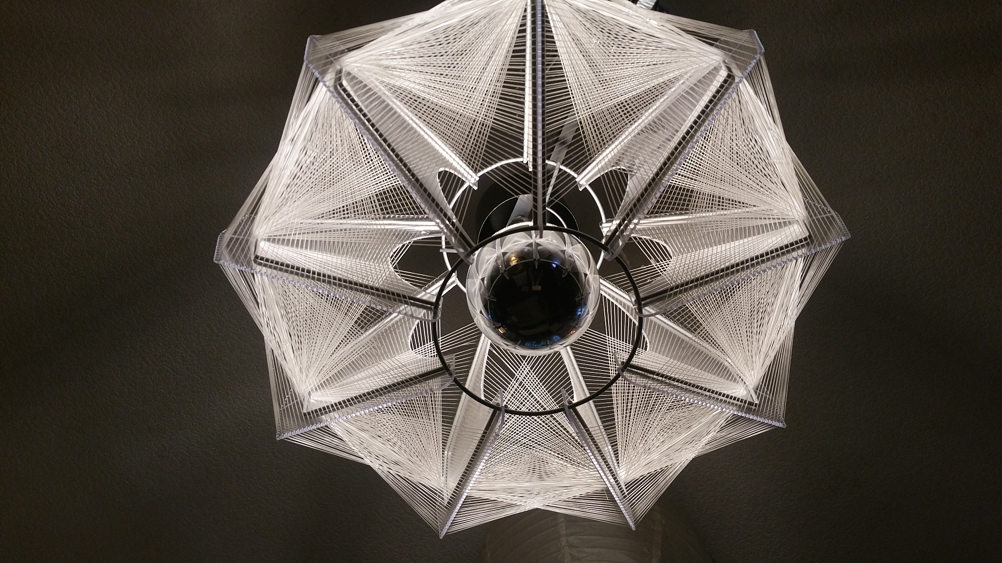 This beautiful space age industrial style pendant lamp shade is made from geometric pieces of perspex, tightly bound together with clear nylon wire. It looks like something from another dimension. Combining it with an over-sized, fully adjustable black angle poise arm and chrome tipped up lighting bulb, makes it perfect for someones modern industrial style apartment or studio flat.